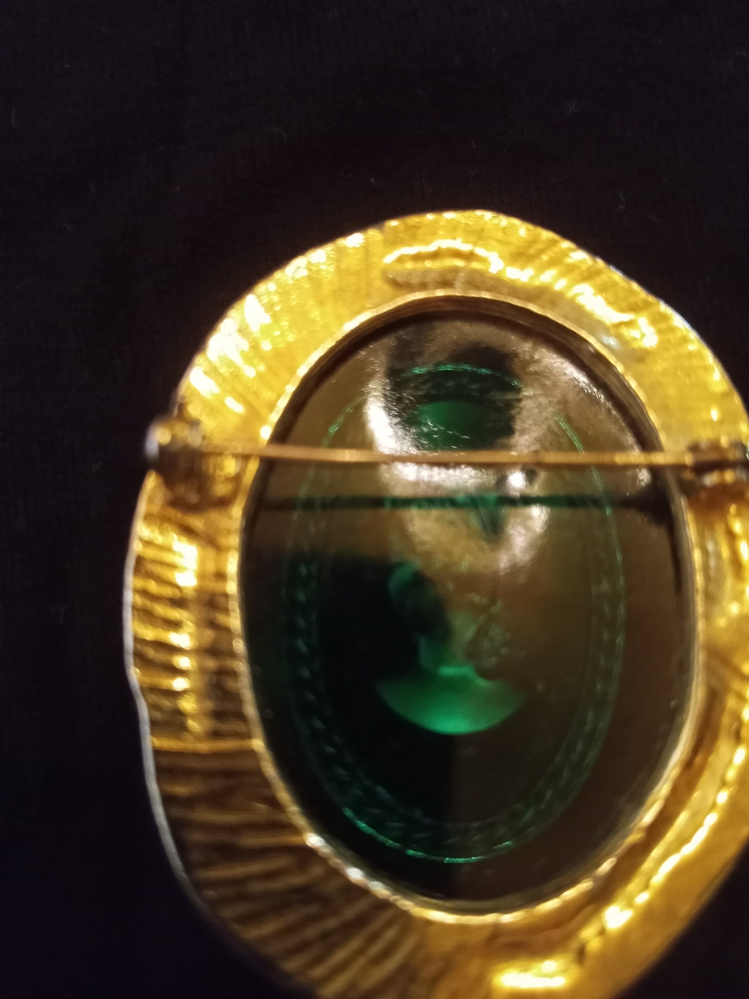 Vintage gold tone oval, green glass intaglio brooch. Large and beautiful detail. 2" tall X 1-1/2" wide